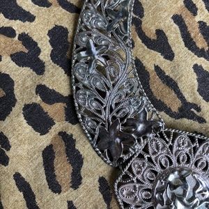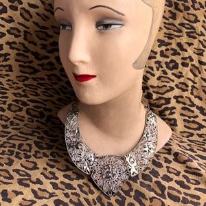 Cleopatra collar bib style. Known Barrera design - Falling Leaves. 60s/70s style but 1980s/90s. Silver tone. Double strand. Center, hinged pendant. Filigree-backed.