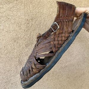 Made in Mexico. Traditional style. Very well crafted. Woven leather upper and sling back. Adjustable upper. Upper sewn/nailed to car tire sole. Dark brown. Flat, without heel. No label/Stamp. Very good vintage condition. Moderate wear on the straps and sole. Leather straps in good shape. Given a quick wipe with saddle soap. See pics. Sold as is.