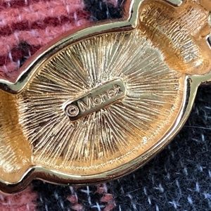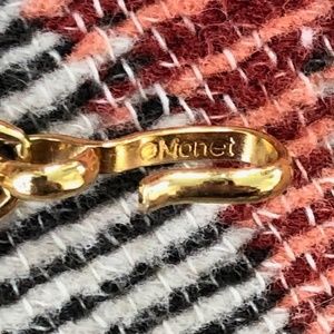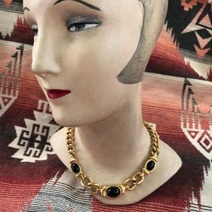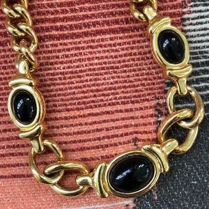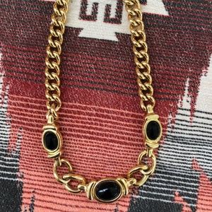 Black hard plastic cabochons, 3. Linked with wide gold tone chain curb chain. Good length - adjustable up to 17inches - and a substantial piece - 114 grams. Stamp: c Monet. Very good vintage condition. No issues of note. See pics. Sold as is. Measurements: Length 17" Width 3/8" Weight 114 grams