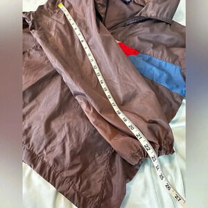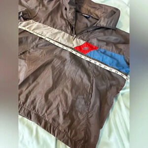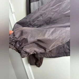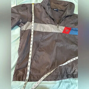 VTG 1980’s Nike Blue Label Grey pullover windbreaker 1/4 Zip. Embroidered Logo. Horizontal light grey, red and blue stripe. Hand warmer pockets. Grey embroidered logo. Unlined. This piece is over 40 years old. There is some fade and sun discoloration to the sleeves and lower hem area and collar. Noted in the photos. The elastic of the of the hem of left arm is visible, also noted in the photos. Please use the photos for measurements.