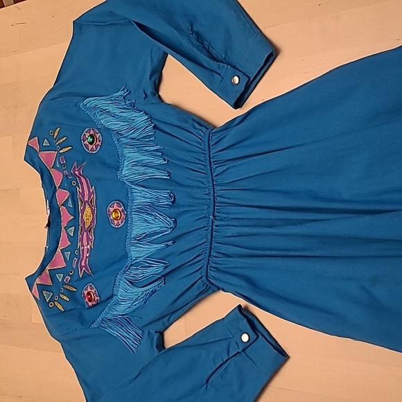 This is a gorgeously unique westernwear cold bright blue dress from Sassa! Vintage, 1980s. Womens medium. 100% breathable cotton. Fringe, aztec pattern, and gemstone details across the chest. Fitted, streatchy, elastic waist with pockets. High neckline pullover the head. There are shoulder pads that could easily be removed. Long sleeved. The last three photos show the flaws(mild discoloration on the shoulder and hem line, and a flaw that blends in but is on the aztec graffic). Please refer to the photos as they are a part of the description. Non-smoking household.