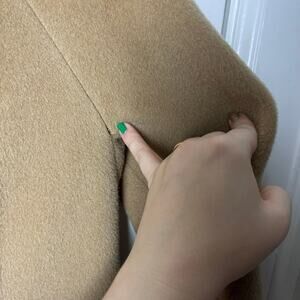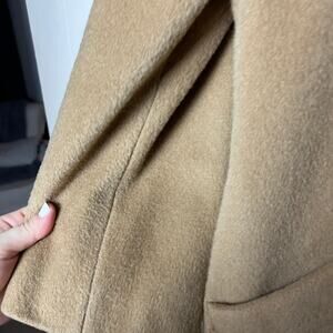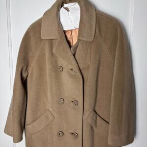 Very good vintage condition - 100% wool jacket. Beautiful camel brown color and double breasted. Longline style with pockets at the hips. Collared. Please note - this piece does not have a size tag. Please check the measurements listed below. Smoke free pet friendly home. All offers are welcome.