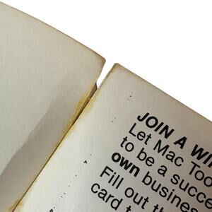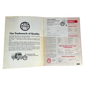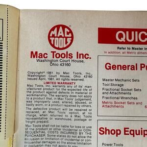 This vintage original "1981 MAC Tools Product Catalog" manual is in GREAT previously used condition. The softcover catalog has cosmetic wear to the edges and corners from age and previous use (see photos). The catalog's pages and front/back covers have cosmetic wear like minor folds and bends, and have spotting and discoloration due to age and previous use (see photos).