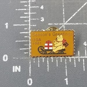 VTG 1981 USA USPS Christmas Stamp Teddy Bear Sled Enamel Pin Season's Greetings