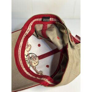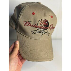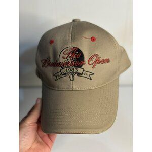 vintage, 1983, Budweiser Open, York PA, baseball cap, hat, embroidered, tan, red, hook loop back, adjustable, retro, 80s, beer memorabilia, golf, sporting event, collectible, brewery, fan gear TEMP1