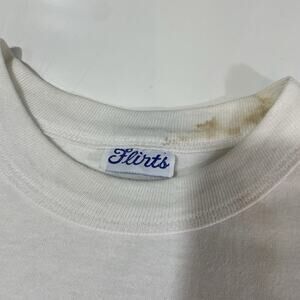The product is a vintage 1985 Flirts Snoopy Woodstock party single stitch stains oversized t-shirt in size XL. This white t-shirt features a classic design from the 1980s with short sleeves made of cotton material. It is unisex and has an original reproduction, perfect for those looking to add a unique and nostalgic touch to their wardrobe.