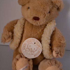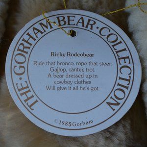 Vintage 1985 Jointed Gorham Collection Ricky Rodeobear Teddy Bear Plush Stuffed Animal Doll Toy. Measures about 13" tall. Has a brown vest with fur trim. He is a light brown tan color. Head, legs, and arms move. From smoke free home and in excellent condition.