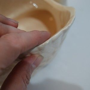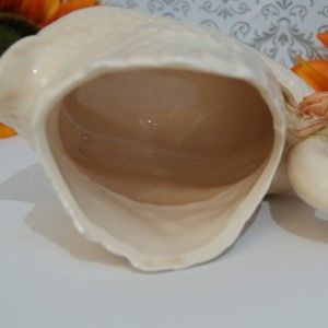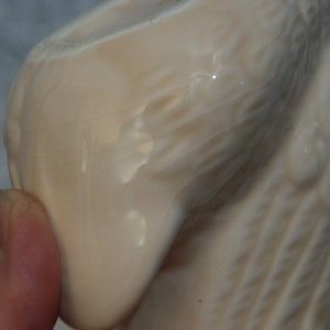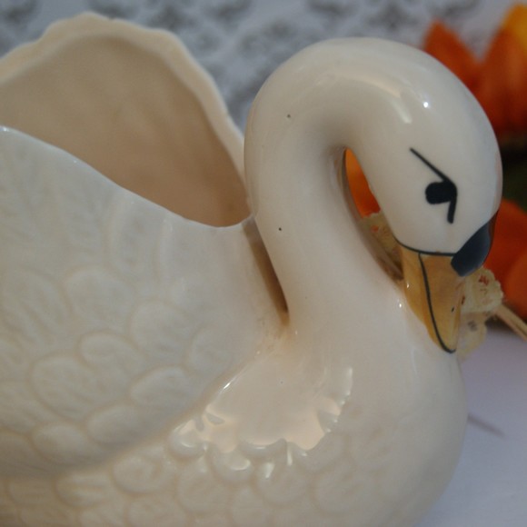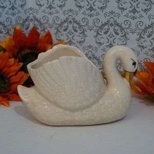 This beautiful swan planter stands approx. 4 inches high and is about 7 inches long. It has some chipping along the edge of the wings, which is pictured , it's not substantial. There's does seem to be crazing throughout, it is pretty old. The tag is still partially there, enough to see the year 1987, that it's Enesco and it was made in Taiwan.