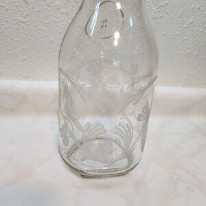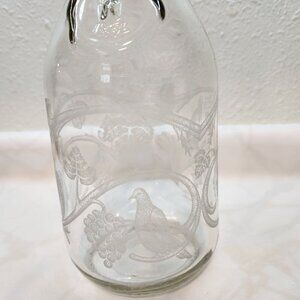 Wine carafe with etched design of birds and grapevines. Artwork done by graphic designer Norman Kosarin for Paul Masson Vineyards. This bottle is ©1988, also marked with since 1852 referring to the Paul Masson brand.