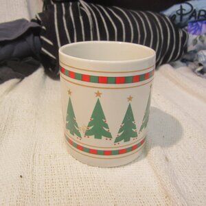 CERAMIC MUG WITH CHRISTMAS TREES ALL AROUND AND RED & GREEN BORDERS