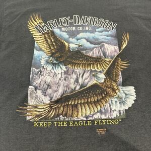 Rare Vintage Single Stitch 1990 Harley-Davidson 3D Emblem tee iconic “Keep The Eagle Flying” eagle + mountain graphic, dated 1990 Fort Worth, TX. Single stitch, soft worn-in cotton, true collectible biker tee. Size XL, USA made, has light wear, fading + *small pinhole giving it authentic vintage character. Refer to images for condition. Due to light and screen difference, the color may be slightly different from the picture.