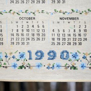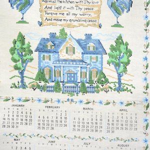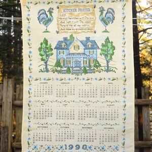VTG 1990 Kitchen Prayer Calendar Towel Blue House in Faux Cross Stitch Design