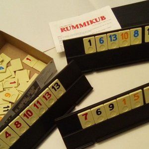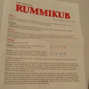 The original Rummikub The fast moving rummy tile game. Rummyikub (Rummy-cube) is played with a set of 106 elegant times that are as durable as they are easy to handle. Like Rummy, players build melds of runs of the same colors or sets of numbers. To start, players meld 30 points or more and place their meld on the table. And for an exciting, additional challenge, opponents can build and change other players' melds to increase their chances of using up all their tiles to make Rummikub and win the hand! Strategy is an important factor, but luck plays its part too. The two wild Jokers can increase your melding power. On the other hand, they'll cost you plenty if you're caught with them in your hand when your opponent has played the last tiles and calls, "Rummikub!" If you're looking for a fast action game where the outcome is undecided until the last play and has a never-ending variety of strategies and play situations, you'll love Rummikub!