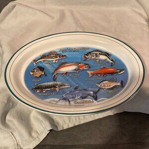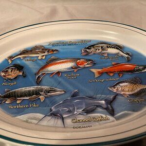 VTG 1990's American Expedition Oval Fish Platter-By @IDEAMAN-Measures approx. 10" Long. Heavy Restaurant Style Ceramic Platter-Collector Plate. Very nice multicolored pictures of Walleye-Bluegill-Northern Pike-Channel Catfish-Crappie-Sockeye Salmon-Largemouth Bass & Rainbow Trout. Definitely for the person who loves to fish. Logo on Back says "Authentic Functional Gift for the Modern Day Explorer."
