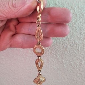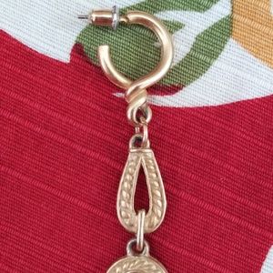 Brushed goldtone. Partial hoop with long dangle that consists of teardrop, circle. Fairly light on - 6 grams. Pierced earrings. No stamp. Excellent vintage condition. No real issues. Clips cleaned. See pics. Sold as is.