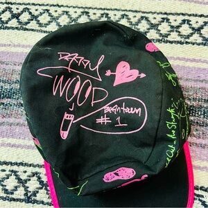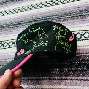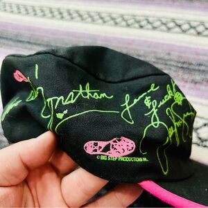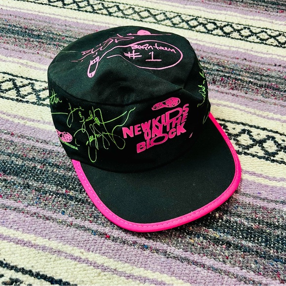 Stylish black cap with New Kids on the Block logo and band member signatures. Perfect for fans. Stretch back.