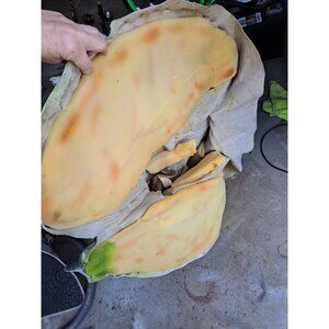 The product is a rare and collectible VTG 1991 Jarrasic Park Dilophosaurus Spitter Wearable Mask. Made of latex material, this multicolor mask is designed for Halloween and is one size fits all. With its tie-in to the popular Jurassic Park franchise and being manufactured in the 1990s, this mask is sure to appeal to both fans of the movies and collectors of unique holiday and seasonal items. Its is normally mounted. Does not come with mount. Measures approximately 29" wide 31" tall 18" deep. Due to age has cracking and brittleness as pictured Very rare and highly collectible. Great for Halloween costume haunted house