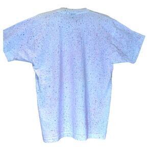 Style - Short sleeve, crew neck, single stitch cotton t-shirt with ship, astronaut and rose design. Faux paint splatter background.