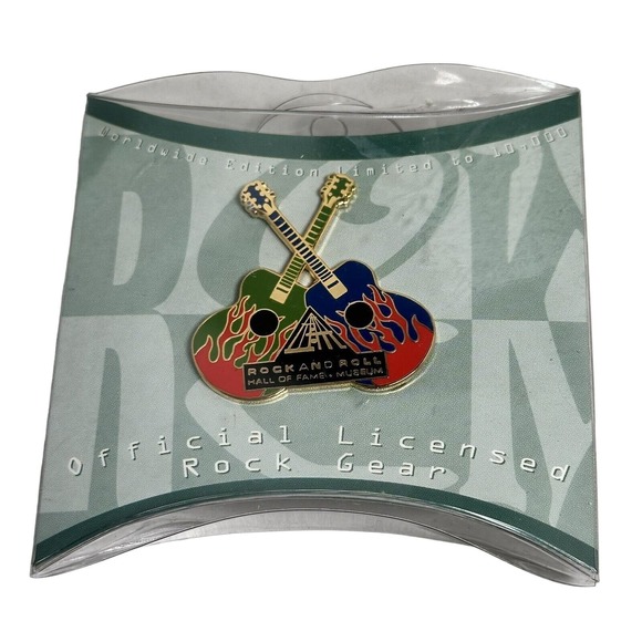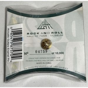 Officially Licensed Rock Gear Rock and Roll Hall of Fame pin in good condition in original packaging. Slight residue from price sticker on front.