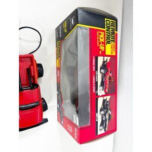The product is a vintage 1996 New Bright Ford Ranger Splash pistol grip remote control truck. This replica of a Ford truck is made of plastic and comes in a bold red color. With its retro design and functional remote control, this toy is sure to bring a touch of nostalgia to collectors or enthusiasts of RC model vehicles.