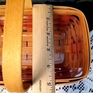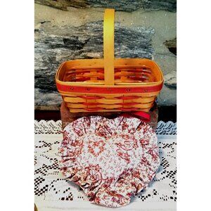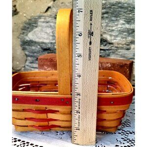 This vintage 1997 Longaberger Sweet Treats Basket Combo features red accent weave, a stationary handle, plastic protector liner, and a charming red and white Sweetheart fabric pillow, perfect for collectors or home decor enthusiasts. Its timeless design adds a touch of nostalgia and love to any space. 8 Inches x 5" x 7"
