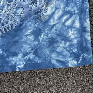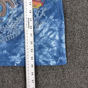 The product is a vintage 1998 T-Scuba T-shirt featuring a Bugs Bunny print by Warner Bros. This medium-sized shirt is made of breathable cotton with a crew neck and short sleeves, perfect for all seasons. The shirt is in a striking blue color with a water, anime, scuba, and Warner Bros theme, making it a unique addition to any man's wardrobe. The retro design and single stitch construction give it a nostalgic feel, making it a must-have for fans of classic Warner Bros merchandise.