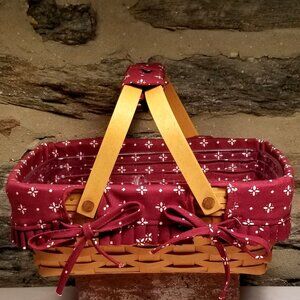 This vintage 1999 Longaberger Medium Chore Basket Combo is in pristine condition, featuring never-used Red Traditions fabric liner and grip. The sturdy plastic protector liner has 3 compartments. Perfect for collectors and enthusiasts alike. 12.5" x 8" x 5.5"