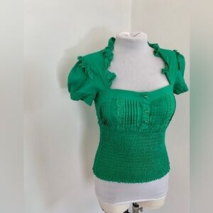 Fun early 2000s bright green corset top, cap sleeves buttons down front with plate and eyelet floral lace details. Wide open V neck, buttons on sleeves, very flattering push up effect with waist cinching ruching.