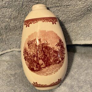 Vintage 2003 Johnson Brothers Pink Transferware Vase or Mini Decanter (Cork is included). Pink Transferware of Farnham Castle Pictured as of 1792. Dishwasher, Microwave and Freezer Safe so can be used as a Decanter or possibly Olive Oil Bottle. Measures approx. 6" High and 3.25" in Diameter. Pattern is Old Britain Castles.