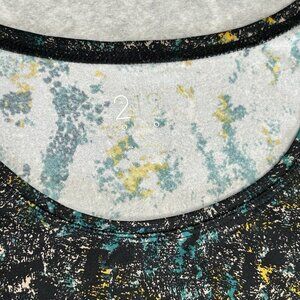 Soft, silky, and stretchy sleeveless blouse with wide shoulder straps and a round neckline. Abstract turquoise, yellow, and white print on a black background. Roomy armholes and comfortable nylon-spandex blend.