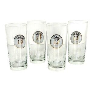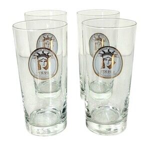 The product is a set of four vintage 22Kt gold highball glasses featuring a Statue of Liberty Centennial gold seal design. Perfect for adding a touch of elegance to your home bar or kitchen, this set is sure to be a conversation starter and a stylish addition to any collection of glassware.