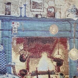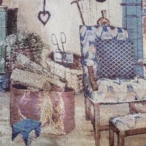 The product is a vintage 27x27 tapestry fabric sample from LaCrosse Furniture Co., featuring a textured design with an indoor country scene. Made of polyester and cotton, this original fabric from 1983 would be perfect for adding a touch of 1980s charm to any country interior design project. The intricate scenery adds a unique and nostalgic touch to this collectible fabric piece.