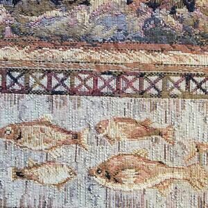 The product is a vintage 27x27 tapestry fabric sample from LaCrosse Furniture Co., featuring a textured design with a Hunting and fishing scene
