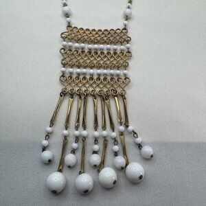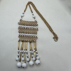 VTG 29” Milk Glass Bead Tassel Necklace Gold Tone Chain Boho Statement Retro