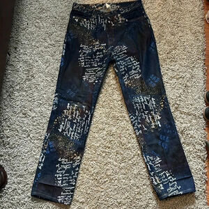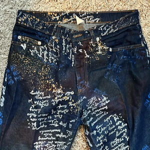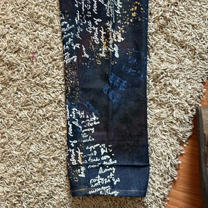 Great Condition, Script writing in white and blue, Wide Straight Leg, Jeans Jacket Sold Separately