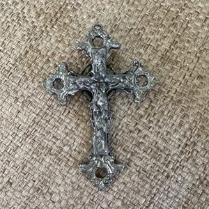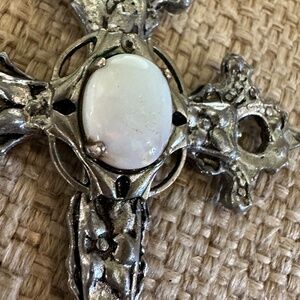 This is an old pewter cross with an opal center stone held by 4 prongs. The stone has a little bit of orange fire. You can see on the close up that is has a couple of imperfections, but only when you zoom in. You don't see them in person. This cross has beautiful metal work. There is no chain, but you can put anything you like on it. The cross is 3" tall and 2" wide.