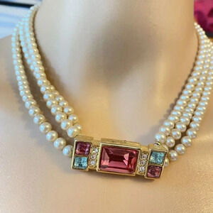 VTG 3 Strand Faux Pearl Gemstone Choker Necklace Party Formal Wedding Princess