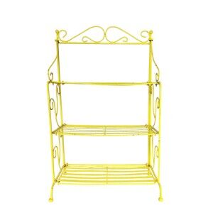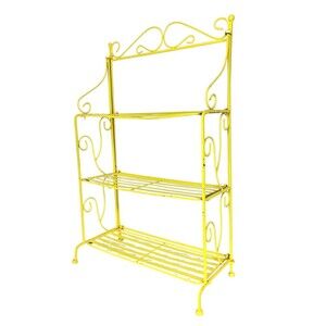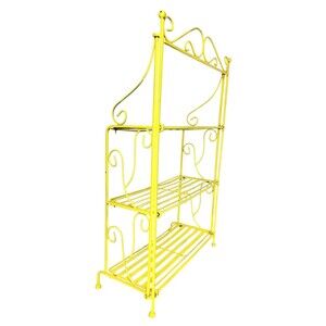 keywords: vintage, wrought iron, rare, hard to find, scroll, antique, vintage plant stand, tiered, shelves, shelf, bookshelf, bookshelves, portable, foldable, collapsible, 40s, 30s, 50s, yellow, vintage garden decor, antique garden decor, MCM, mid-century, mid-century modern, cute,