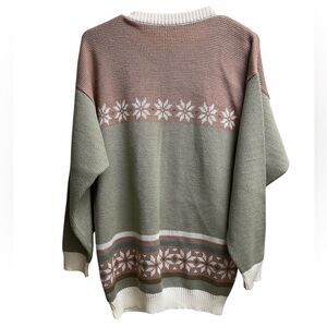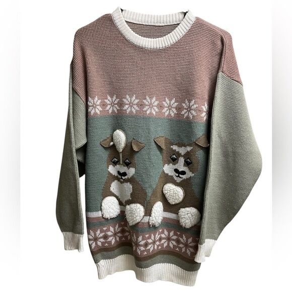 VTG 3D Terrier Dog Pink Green White Striped Fair Isle Knit Sweater SZ L