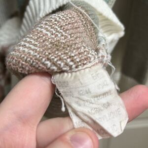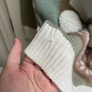 Great used condition. This is unbranded and from Europe. 3D dog graphics with folding ears and Sherpa patches of hair. Striped and northern isle background. Some small knit pulls on the arms, but nothing drastic. I repaired a small hole on the bottom hem of the sweater (see photo).