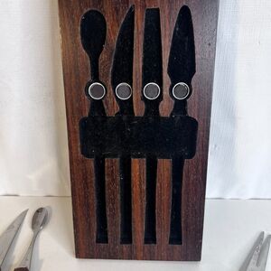 Includes long handled spoon, knife, bottle opener, and fork on magnets in felt lined slots
