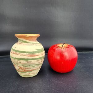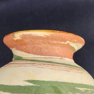 Small green & peach swirl vase by Silver Springs Pottery of Florida. Glazed on the interior to be water tight, matte finish on the exterior. Niloak style. Use as a posey vase or to hold artist/make up brushes, pens, pencils etc.