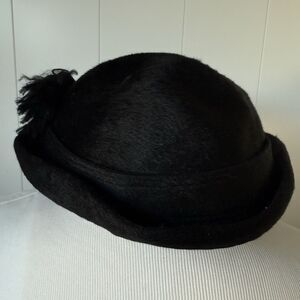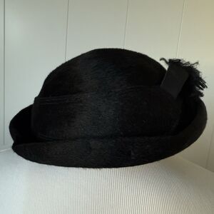 VTG 40s 50s I. Magnin Small Half Hat Derby Fedora Italy Retro Black Tassel Scarf. Maker is I. Magnin (high fashion, luxury department store from San Francisco (1965 - 1995) and stamped South (? hard to read) Body made in Italy. Excellent condition, very soft furry fuzzy wool or mohair material, brim is self trimmed along with a wide grosgrain ribbon in a scarf-like tassel design. Mid-Century 40s 50s era (guess). Small size, likely made to fit with a jaunty slant. Great for church, holiday party, garden party, high tea, opera, ballet or other special occasions. Please see pics for measurements.