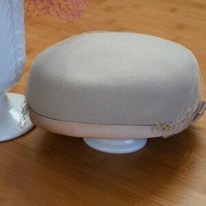 one Evelyn Varon Exclusive wool felt beige pillbox hat with netting, satin trim, and two hat pins; approximately 7 inch diameter