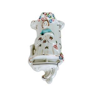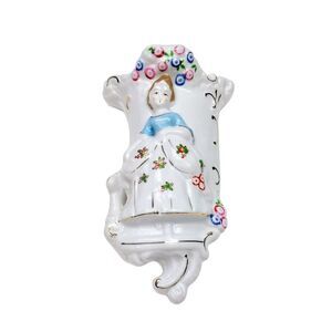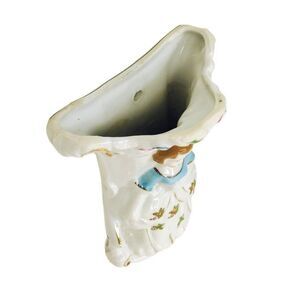 This delicate pocket wall vase features a hand-painted Victorian lady surrounded by beautiful flowers. The porcelain material gives it a glossy finish for a timeless look. The vintage piece was originally manufactured in Japan in the 1940s and has a charming multi-color design.
