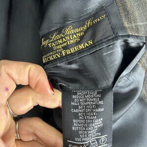 This designer suit is a regular fit and has a chest size of 41. It is a single-breasted cut with a two-button front button style and a single-vented back. This suit is a true representation of old money and quality, and it is sure to turn heads wherever you go. Dry clean only.