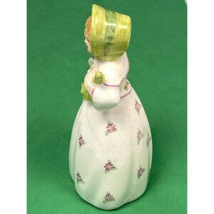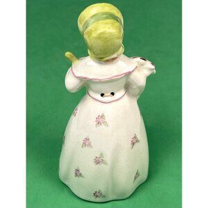 VTG 4.5" Handpainted Ceramic Girl BELL Figurine Floral Bouquet Green Bonnet EUC