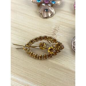 2-Amber Rhinestones Floral Spray Gold Tone Brooch Pin