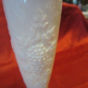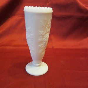 VTG 50'S MILK GLASS MOLDED VASE W/GRAPE DESIGN & LEAVES, FOOTED