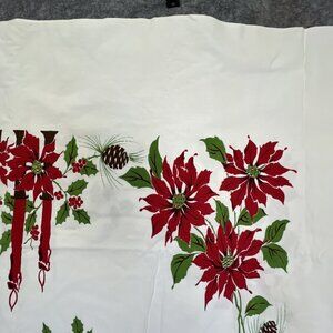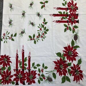 VTG 50s Christmas Tablecloth Hand Printed with Candles Poinsettias and Pinecones
